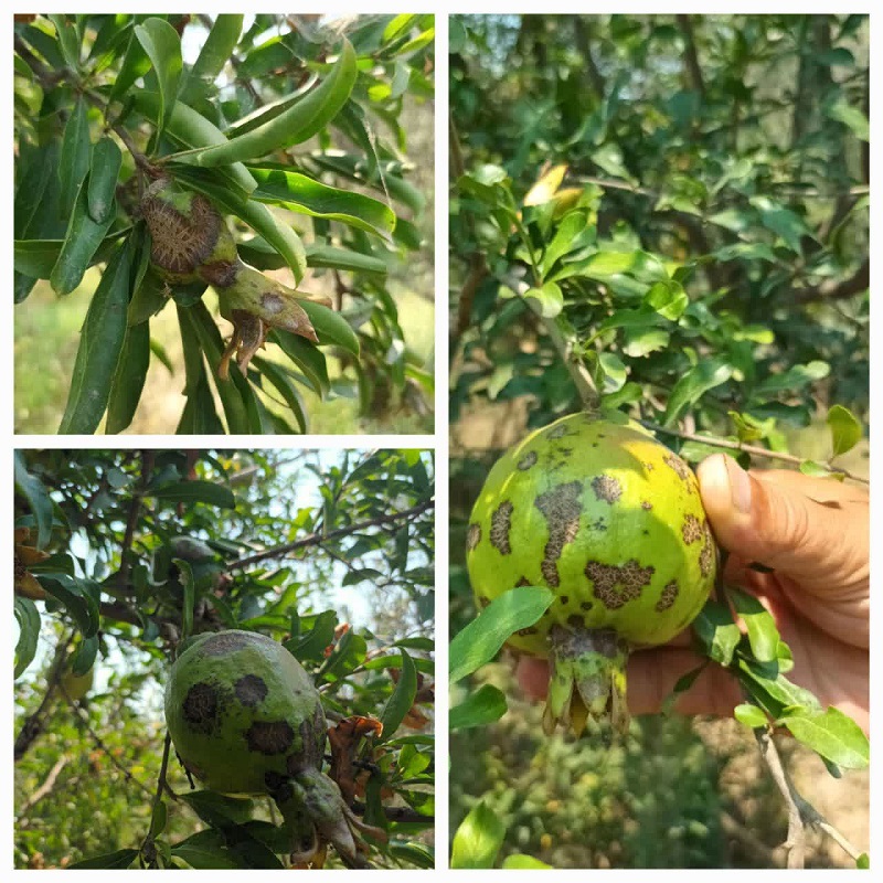بررسیهای میدانی از باغات انار شهرستان رودبار نشان میدهد که هر دو نوع انار محلی (ترش) و شیرین نسبت به این بیماری حساسیت بالایی دارند. نخستین علائم بیماری با لکههای زنگار روی پوست میوه ظاهر میشوند و بهتدریج به حالت برآمده و کرکی تبدیل شده که تأثیر منفی بر زیبایی ظاهری و بازارپسندی محصول دارد.