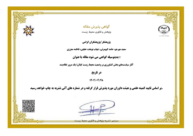 بهگزارش روابط عمومی مرکز تحقیقات و آموزش کشاورزی و منابع طبیعی گیلان، مقالهای با عنوان «بررسی آثار سیاستهای بخش کشاورزی بر محیط زیست استان گیلان؛ یک مرور نظاممند» که توسط پژوهشگران این مرکز، سعید مهرجو، حامد کیومرثی، شهاب نوبخت و فاطمه معززی نگارش شده است، موفق به پذیرش نهایی شد.