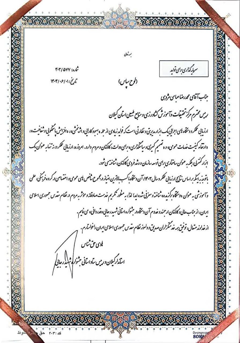 این مرکز با ارائه دستاوردهای نوآورانه در حوزه آموزشهای تخصصی کشاورزی، توسعه روشهای علمی در مدیریت منابع طبیعی و ارتقاء فرهنگ سازمانی، توانست در ارزیابی عملکرد سال ۱۴۰۳ از سوی سازمان مدیریت و برنامهریزی استان و استانداری گیلان، رتبه ممتاز را به خود اختصاص دهد.