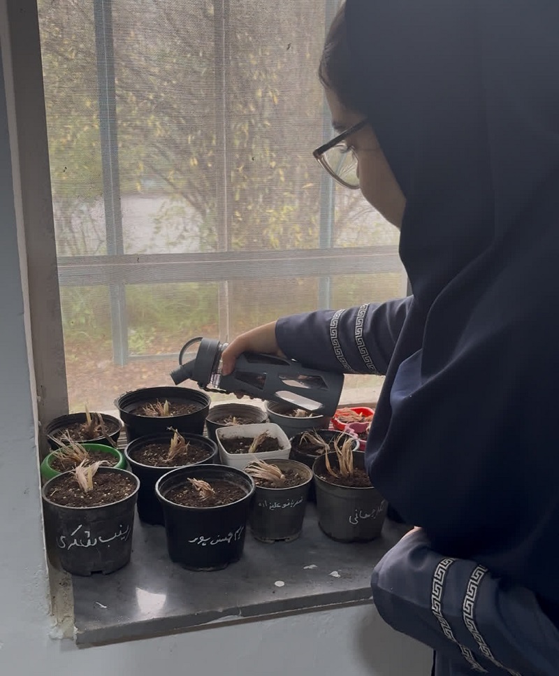 در این پروژه آموزشی، پیازهای سالم زعفران در گلدان‌هایی با خاک سبک و زهکشی مناسب کاشته شدند. دانش‌آموزان با رعایت اصول آبیاری کم و تأمین نور کافی، توانستند مراحل رشد این گیاه ارزشمند را از نزدیک مشاهده کنند.