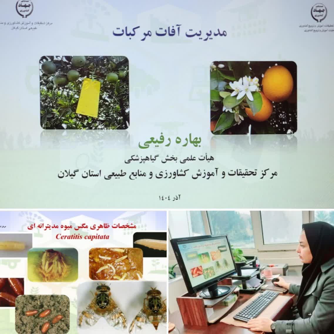 در این برنامه، بهاره رفیعی، عضو هیأت علمی بخش گیاهپزشکی مرکز؛ به عنوان مدرس حضور داشت و به تشریح آفات کلیدی باغهای مرکبات کشور پرداخت. وی تازهترین یافتههای تحقیقاتی را ارائه کرده و مهمترین آفات شامل: مگس میوه مدیترانهای، مینوز برگ مرکبات، شپشکها، تریپس، کنهها و سایر عوامل خسارتزا را معرفی نمود.