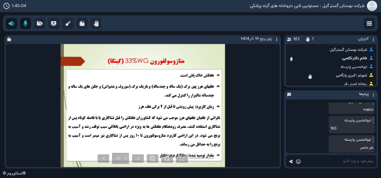 این دوره ویژه مسئولین فنی داروخانه‌های گیاهپزشکی استان بود که توسط سمیه تکاسی، عضو هیات علمی بخش تحقیقات گیاهپزشکی مرکز، به صورت وبیناری، برگزار گردید.