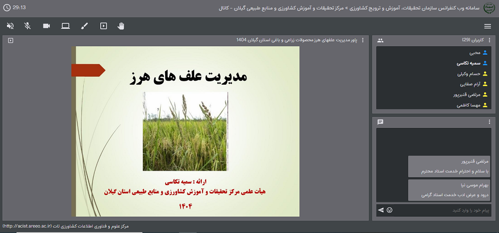 به گزارش روابط عمومی مرکز تحقیقات و آموزش کشاورزی و منابع طبیعی گیلان؛ در اقدامی به منظور حفظ و ارتقای بهره‌وری محصولات زراعی و باغی استان، کارگاه آموزشی تخصصی "شناسایی و مدیریت علف‌های هرز" با تدریس سمیه تکاسی، عضو هیات علمی بخش تحقیقات گیاهپزشکی مرکز؛ به صورت وبیناری در مرکز، برگزار شد.
