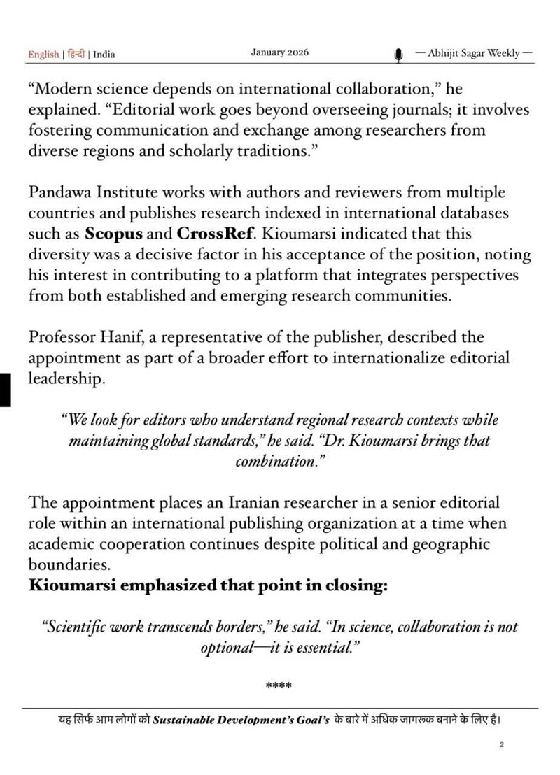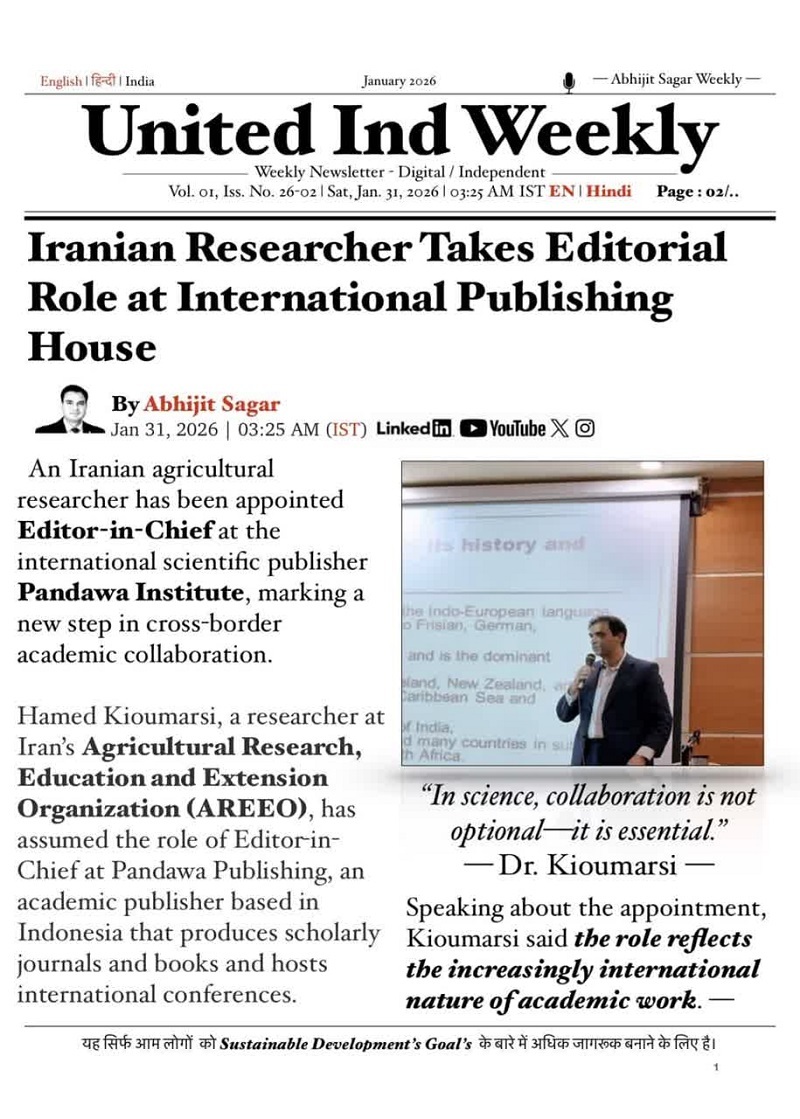 به گزارش روابط عمومی مرکز تحقیقات و آموزش کشاورزی و منابع طبیعی گیلان؛ حامد کیومرثی، پژوهشگر و متخصص حوزه نشر علمی مرکز؛ در گفتوگویی با یک روزنامه هندی، از همکاری خود با انتشارات پانداوا به عنوان سردبیر خبر داد.